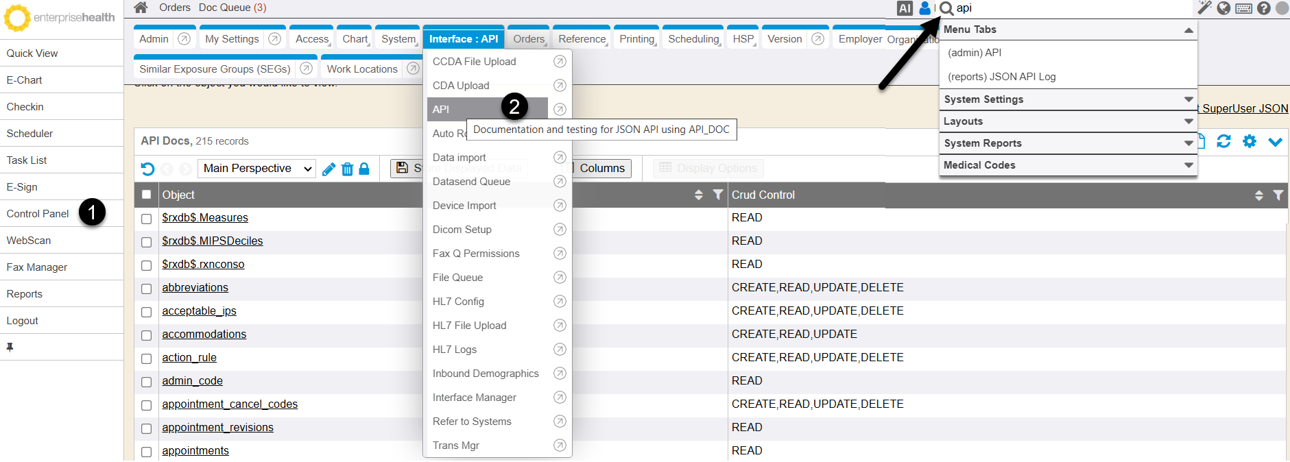 Interactive, dynamic documentation of the Enterprise Health API can be found inside the product. Navigate to the API tab of the Control Panel or use the Search tool located in the upper right hand corner of the application for full visibility of the various objects and their APIs.