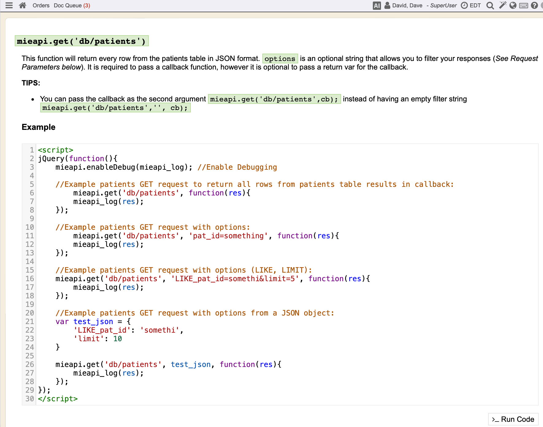 System Administrators can explore each object type and then click on the Object to experiment with the javascript api. The >_Run Code button on the lower right allows System Administrators to experiment in real time.